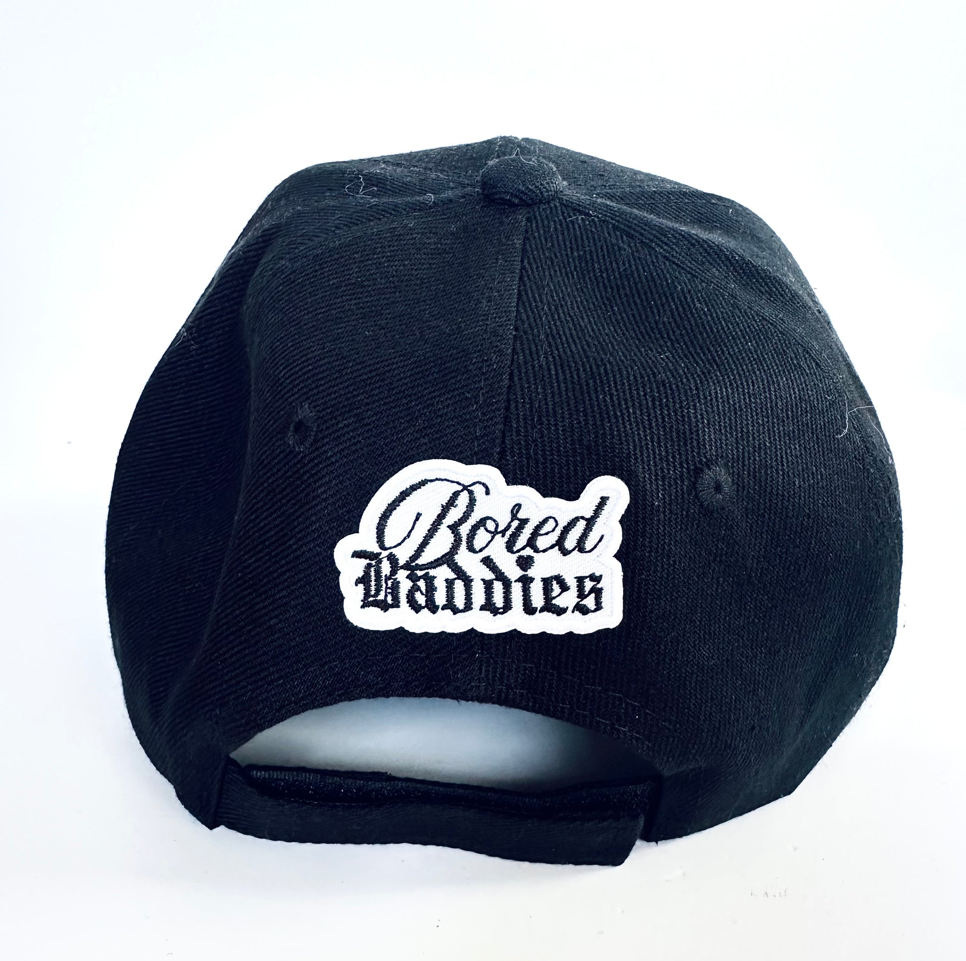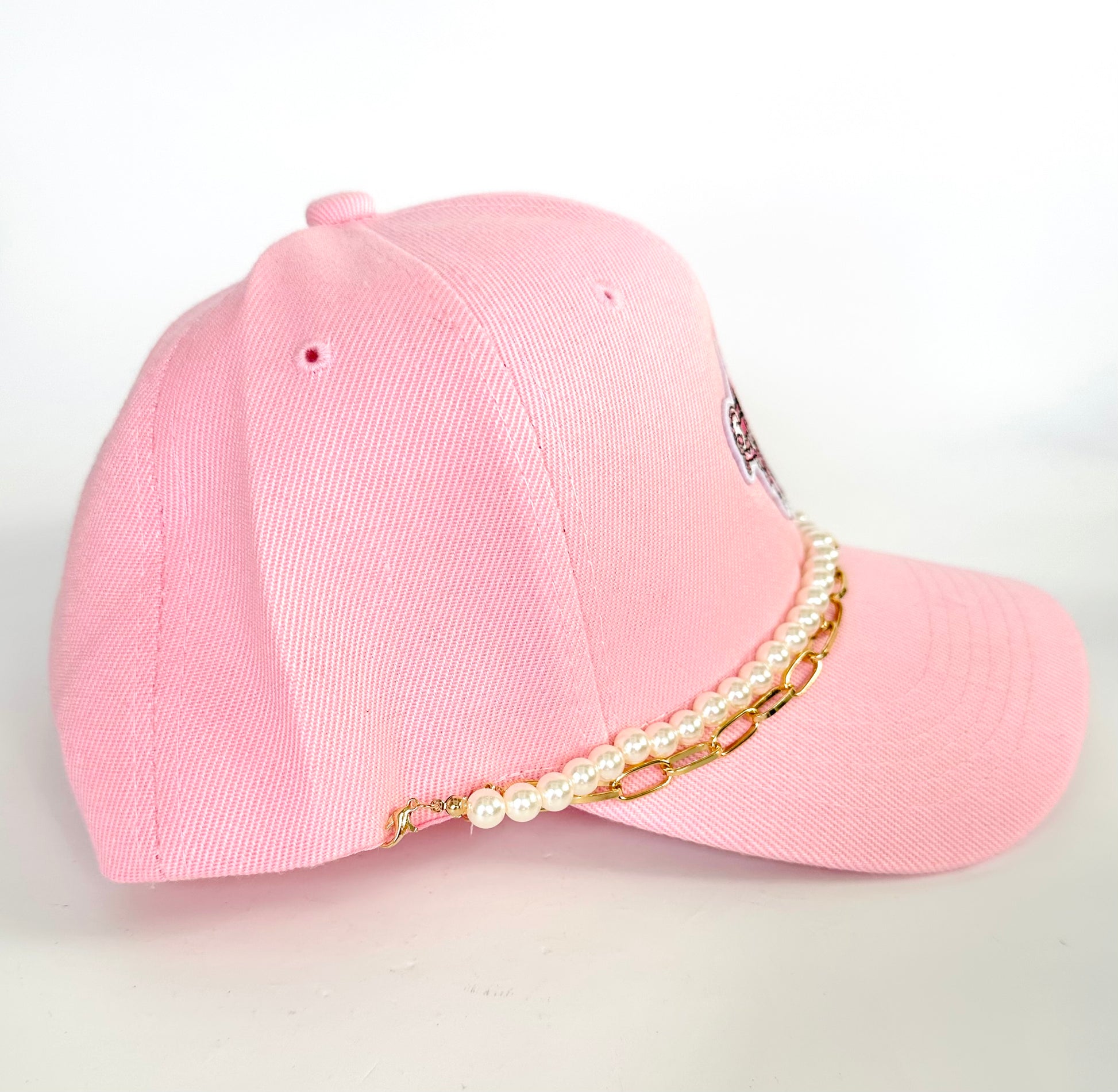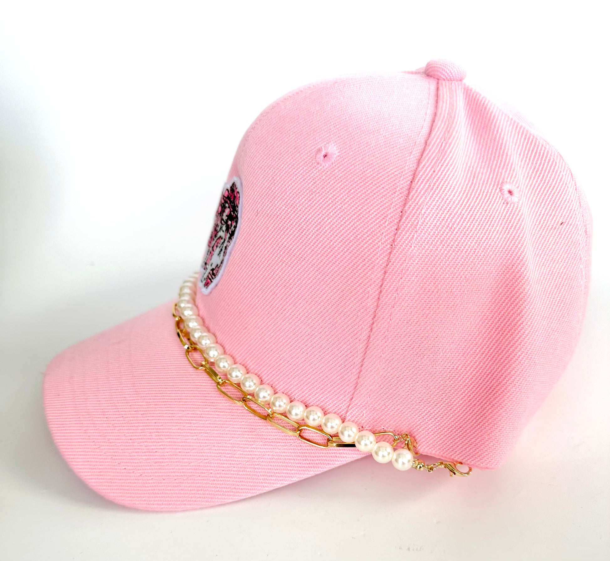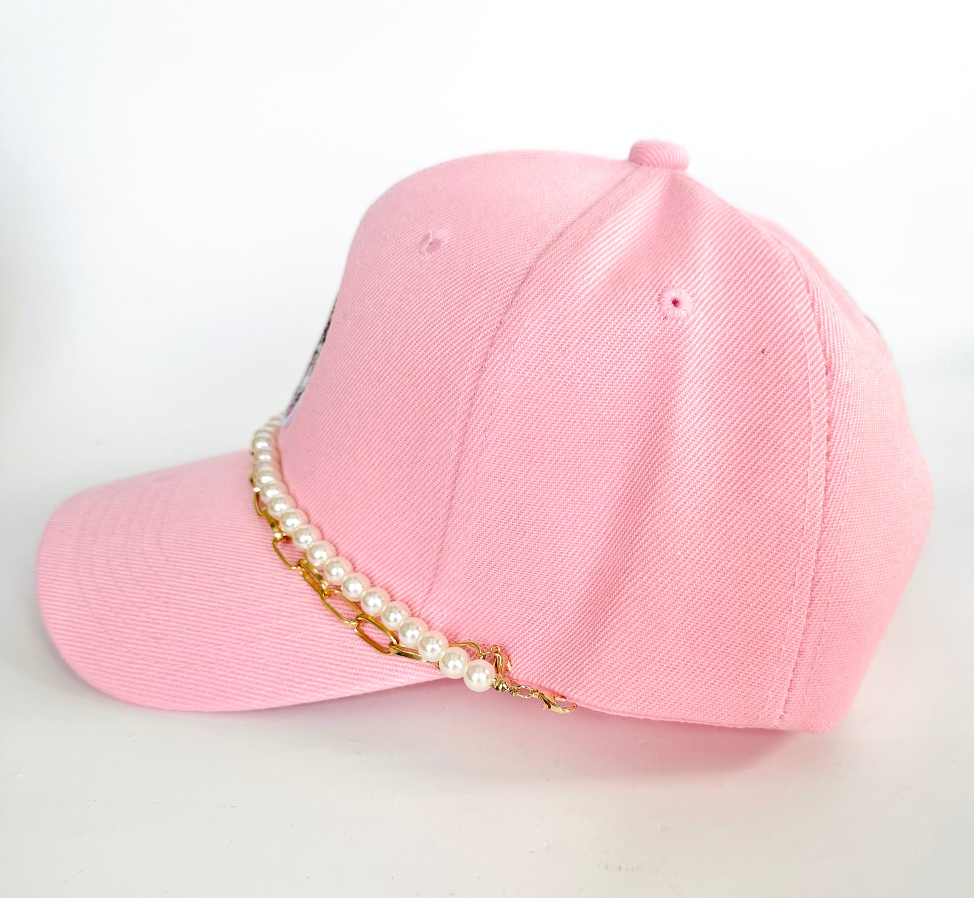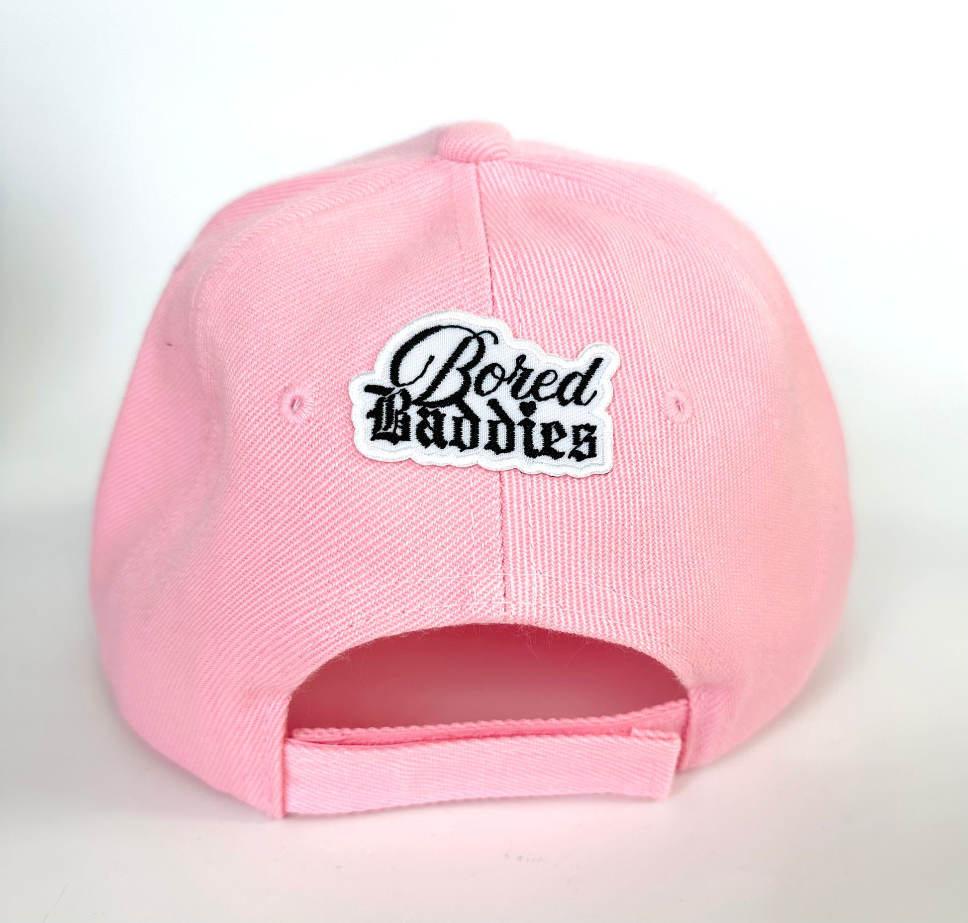 This is a Bored Baddies Baseball Cap that is adorned with two removable hat chains that can be styled as you like! The chains are clipped on to the sides (no holes or punctures). Velcro adjustable strap at the back. Comes in pink or black