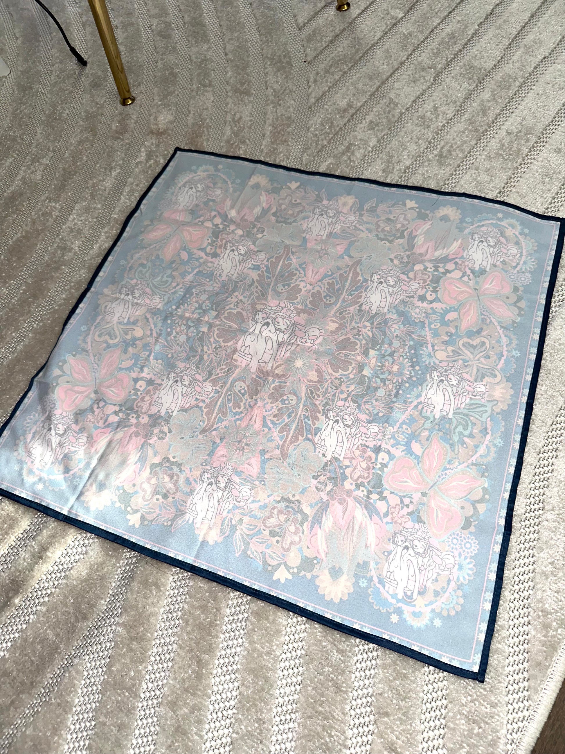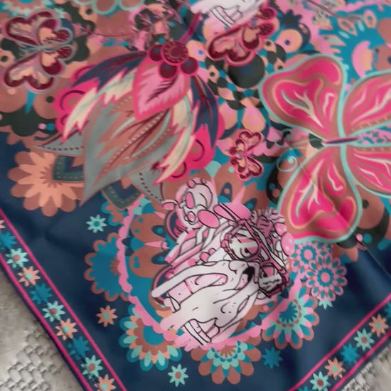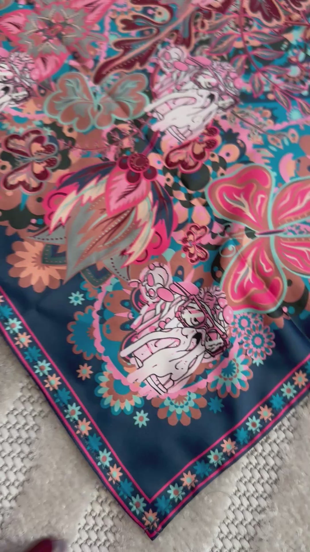 This is a lightweight, 100% polyester square scarf measuring 20.87” x 20.87”. Can be worn as a head scarf, a neck scarf or a head band! Easy to pair with a T-shirt or simple blouse.
