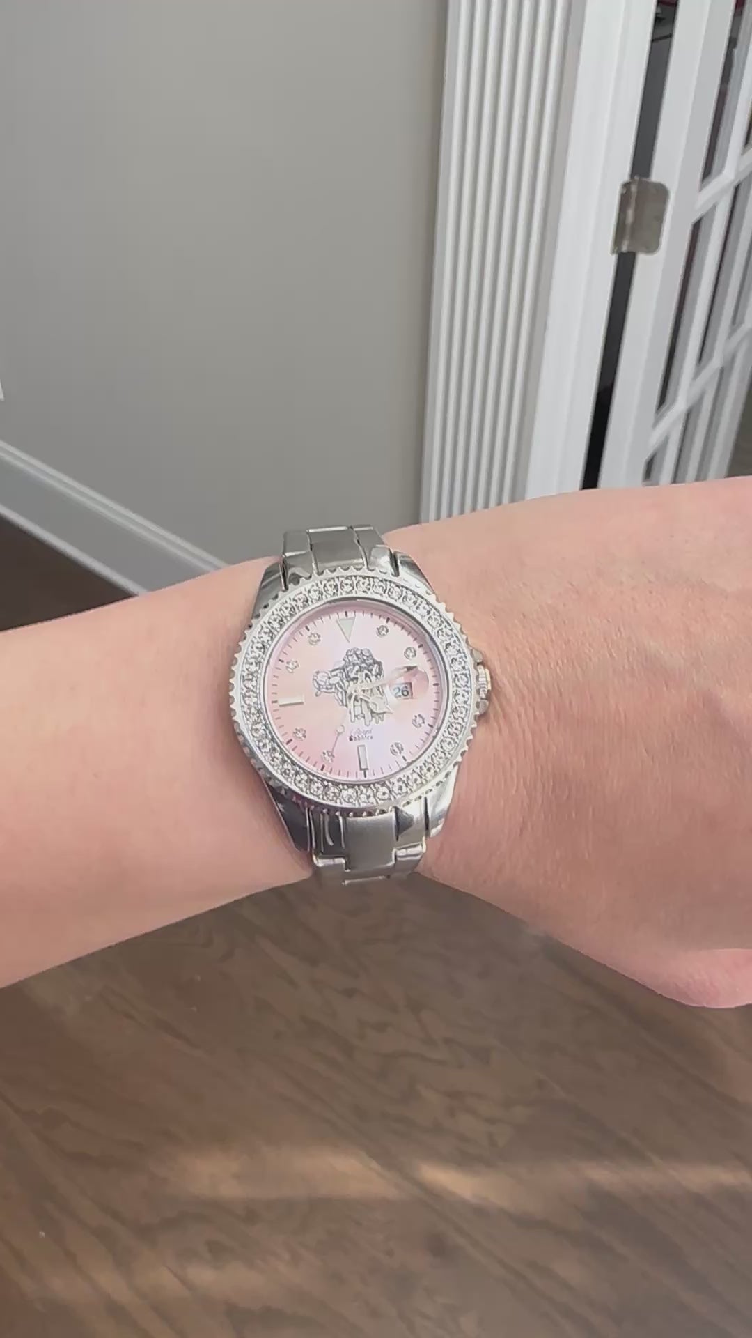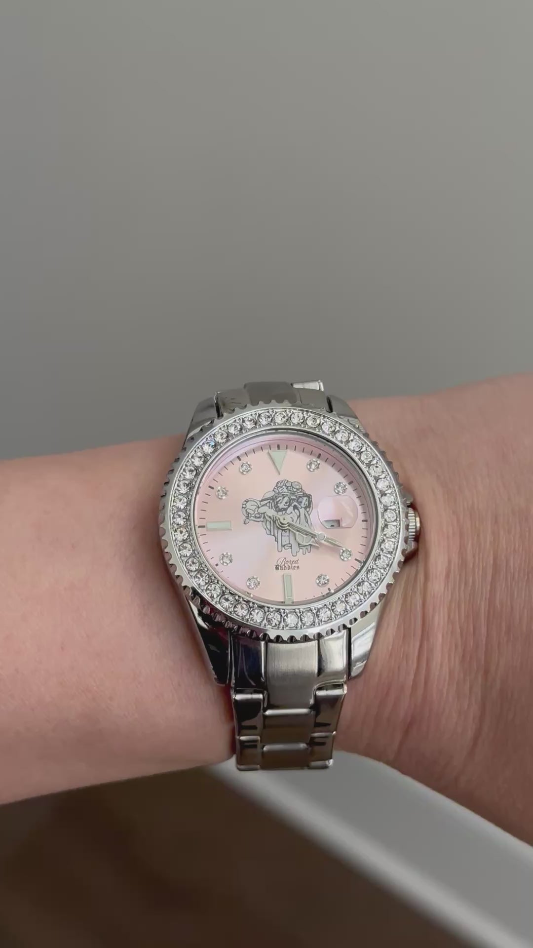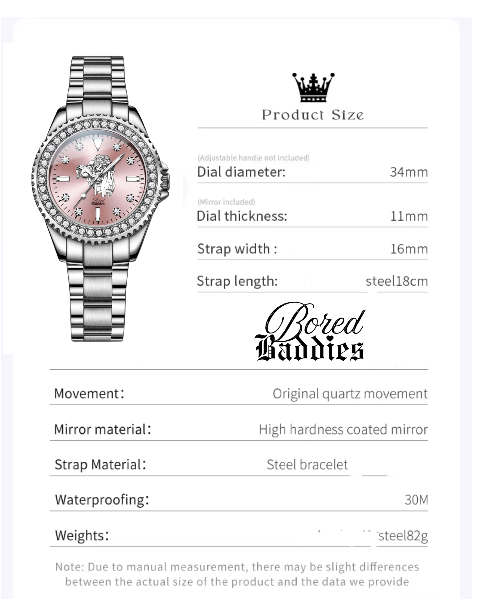 This is a Bored Baddies Silver Pink Stainless Steel Women’s Watch. It is bezel set with sparkling Cubic Zirconia with a gorgeous pink background. This watch makes a BAD statement. Elegant and stunning, it gives an high-end feel for date night but can also be worn with an evening gown. It has quartz function, a 20mm stainless steel band, a glass dial, and is 30mm waterproof. It comes with a Gift Box and Watch Adjuster.