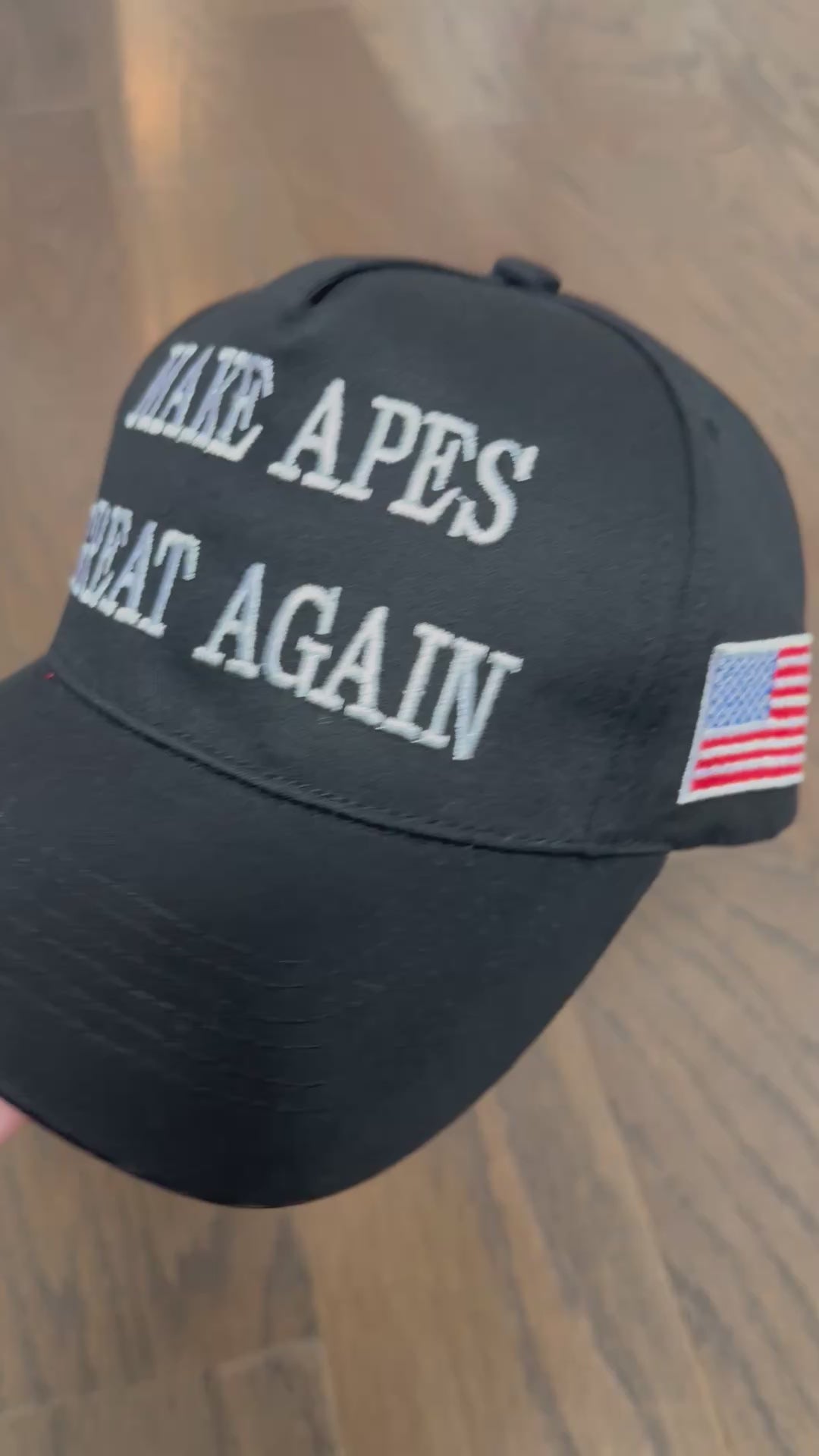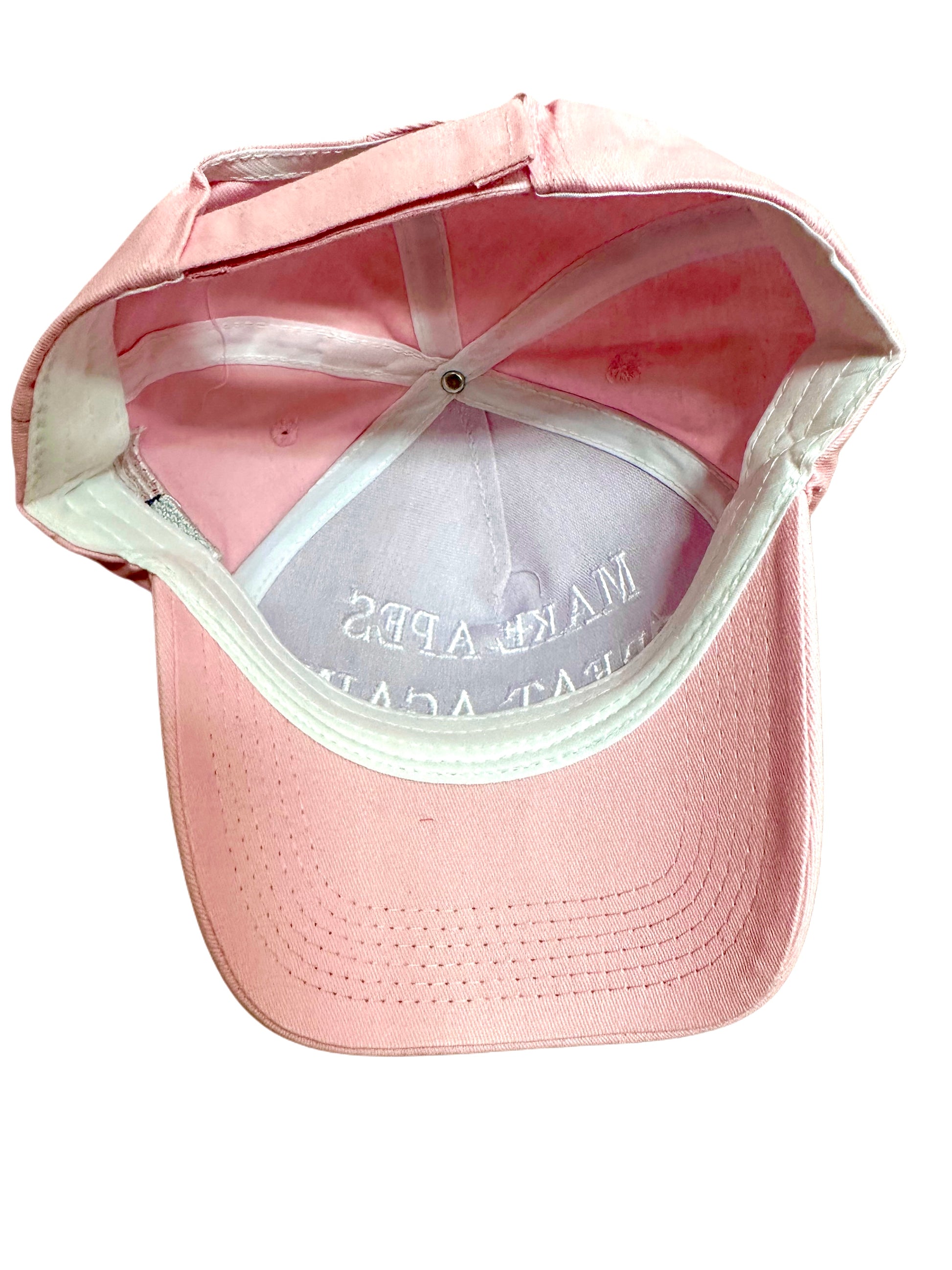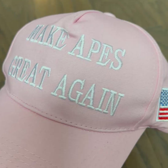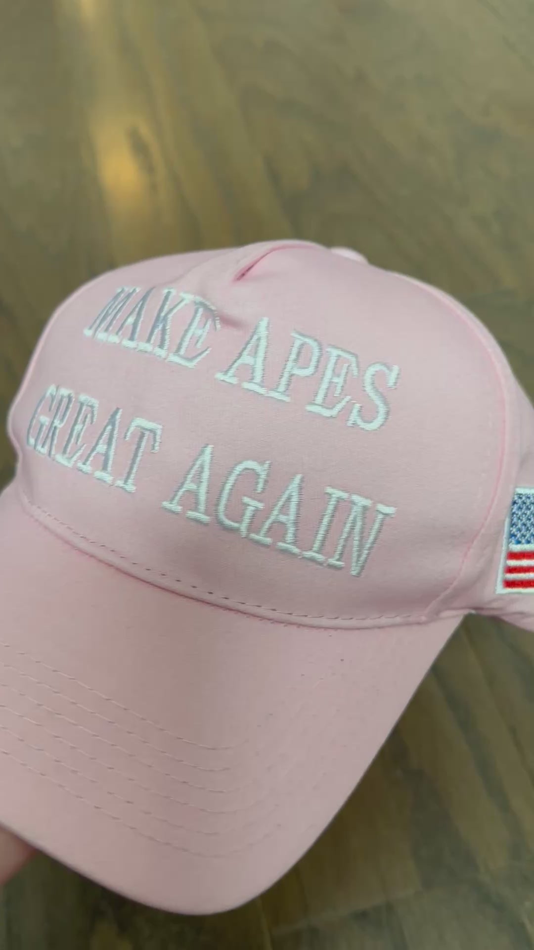 This is a unique “Make Apes Great Again” Bored Baddies Baseball Cap. Velcro adjustable strap at the back. Comes in pink or black