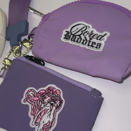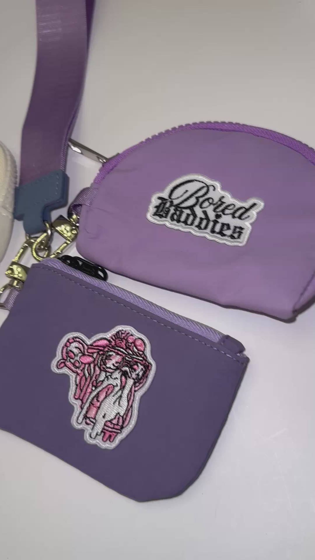 This is a Bored Baddies nylon dual pouch wristlet. The wristlet and pouch’s are removable. Two zippered lined compartments to store coins, lipstick, floss picks, tampons, cards!!