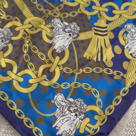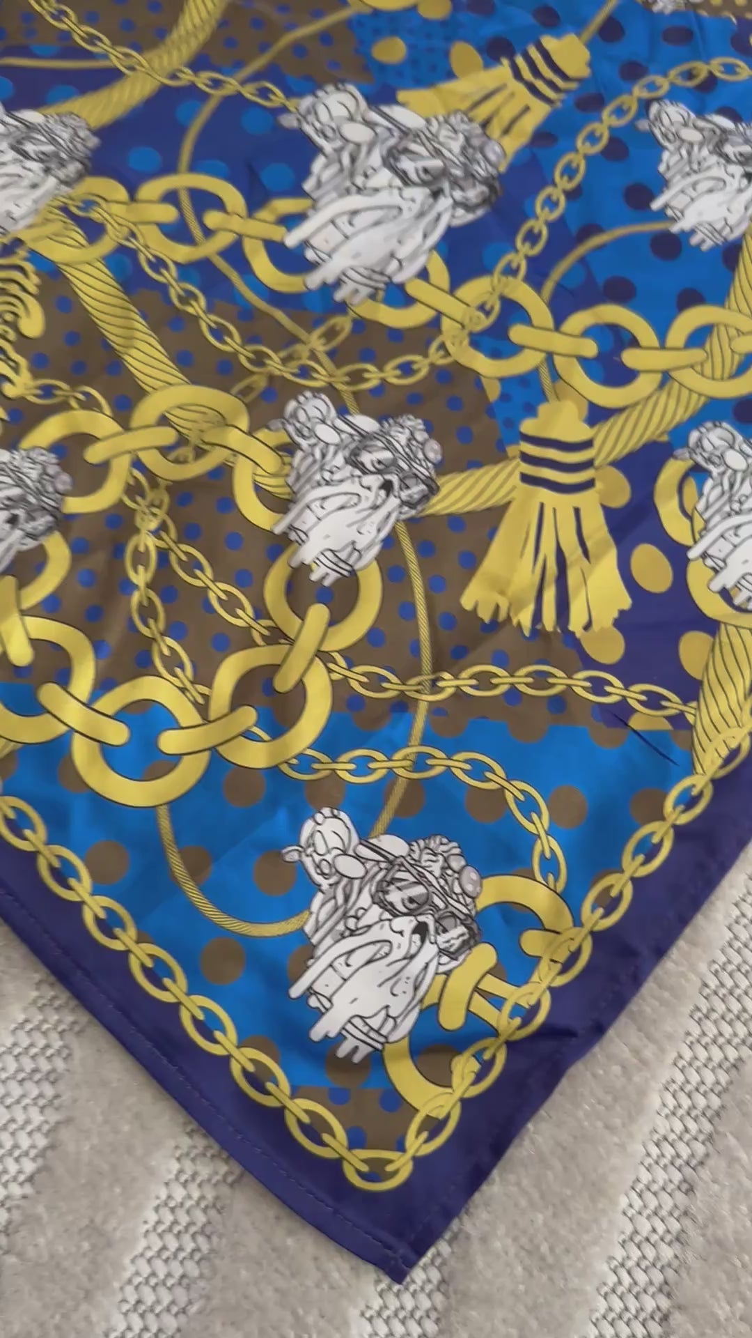 This is a lightweight, 100% polyester square scarf measuring 20.87” x 20.87”. Can be worn as a head scarf, a neck scarf or a head band! Easy to pair with a T-shirt or simple blouse.